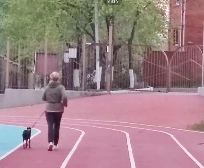 Дама с собачкой бегали трусцой по стадиону. Будто это не подвиг и не новая жизнь с понедельника, а обычное начало дня.