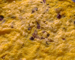 2 яйца, немного молока и муки, половина красной луковицы, 2 стловые ложки зерненого творога, соль, перец